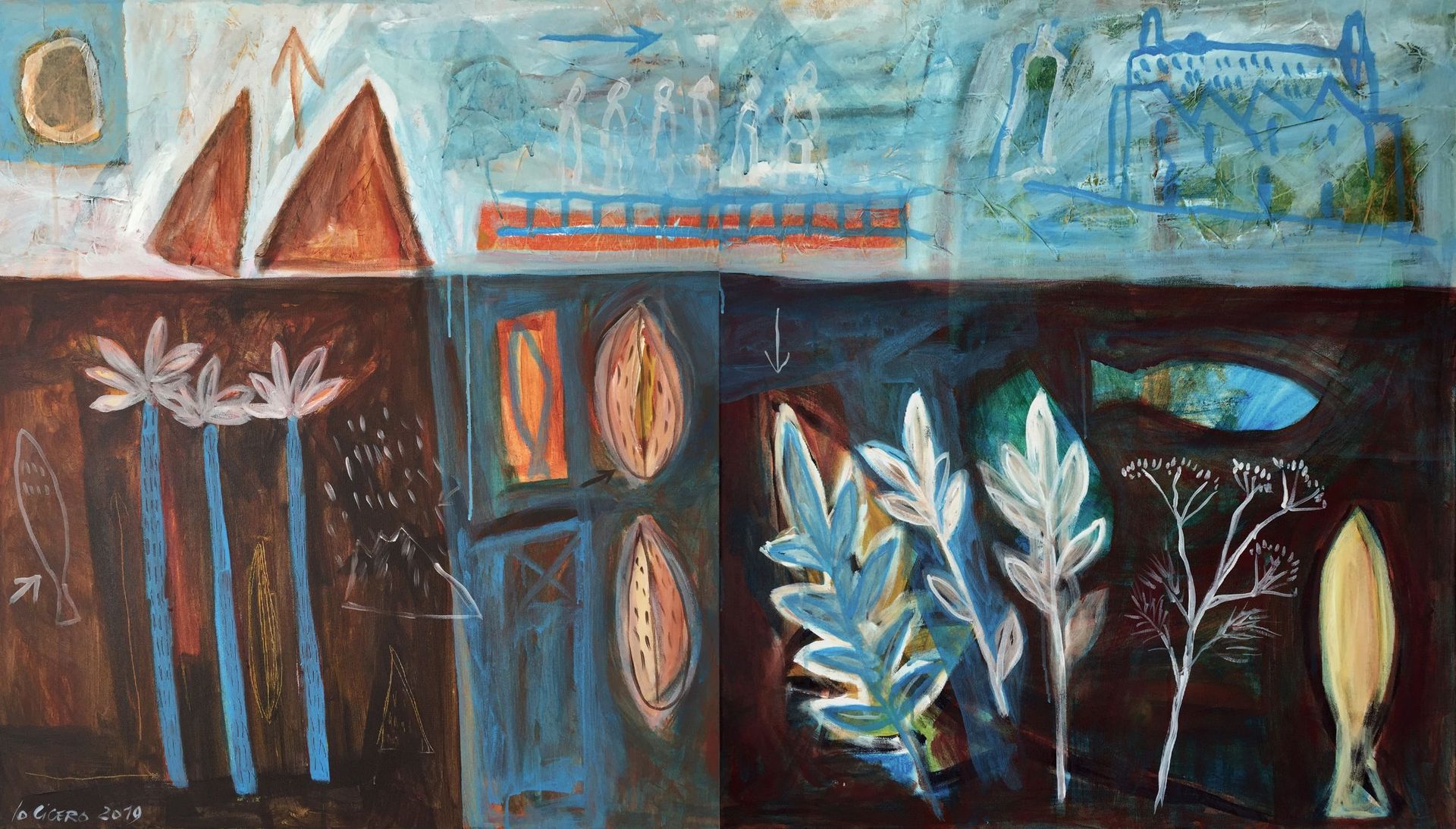 Réalisé au cours d’un symposium artistique en Pologne le diptyque « Exode.. » témoigne du souvenir, exils, vies volées, en jouant et se jouant de signes graphiques ou picturaux relevant d’une géographie intime. C’est une langue de signes, où signifiant et signifié structurent un espace poétique personnel qui invite au voyage intérieur, au songe. Décryptable, évident, inintelligible ou mystérieux, le signe fascine. Accompagné ou non, de mots ou de lambeaux de phrases, il me permet d’exprimer un roman pictural de lignes et de formes posées sur le seul plan de la toile.